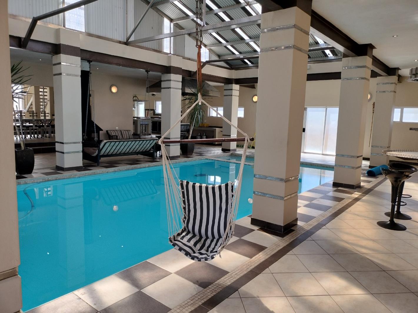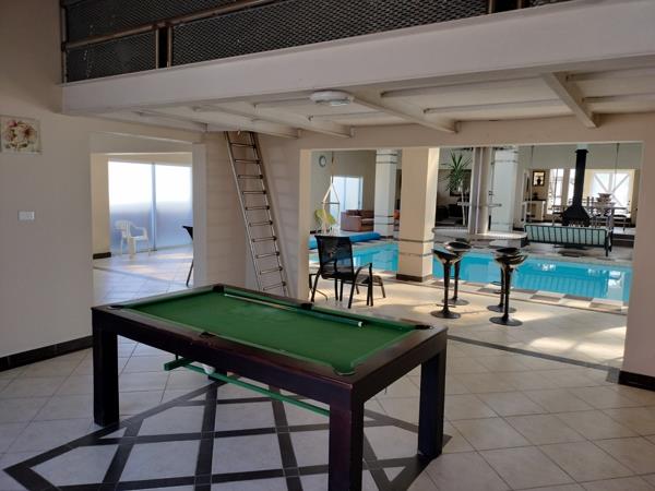 The stunning focal pool area with extra high ceilings is surrounded be a cosy lounge with fire place, a play room with pool table and