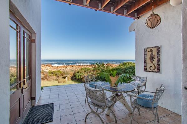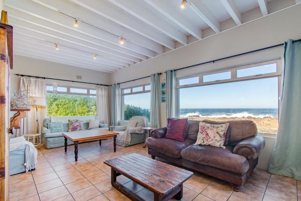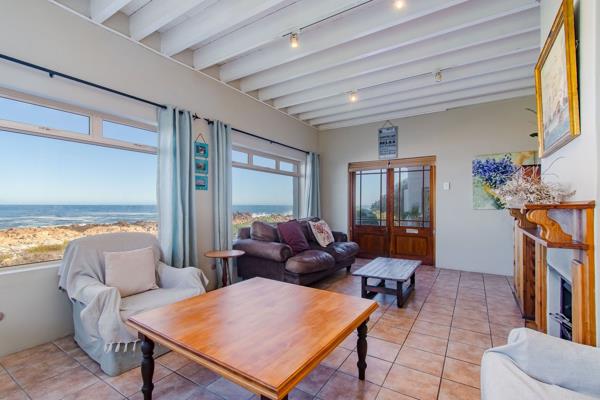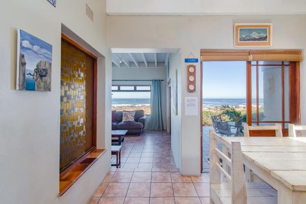 Downstairs and at the end of the passage is a bedroom, with built-in-cupboards and an en-suite. Two storage rooms lead to the dining room on the right. The expansive living room has large windows to appreciate the amazing sea views, as well as a fireplace for Winter evenings. Both the living room and dining room have doors leading to the back veranda where a built-in-braai is ideally situated to enjoy the sounds of the roaring surf.