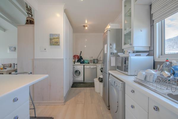 The kitchen, neatly tucked at the back, is practical and welcoming, with a scullery that includes ample cupboard space, a dishwasher, washing machine, dryer and a large fridge. A dual-fuel range stove with electric plates keeps things versatile, and the kitchen window frames a postcard view of the iconic Hangklip Mountain.