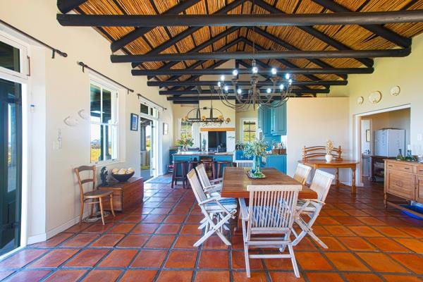 Set on 4.7ha at the foot of Hangklip Mountain, the home embraces its surroundings with a north-west facing courtyard and a wrap-around veranda framing uninterrupted sea views. Four bedrooms (three en-suite), light-filled living spaces, and double doors from every room open to either the mountain-facing courtyard or the sea-facing veranda, creating an effortless flow between indoors and out.