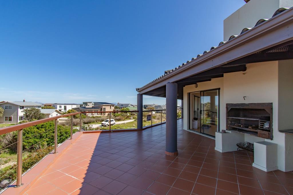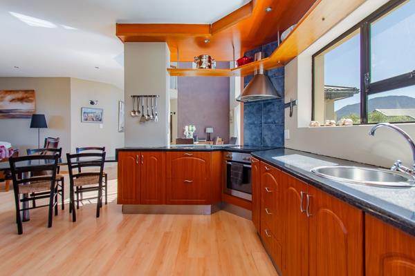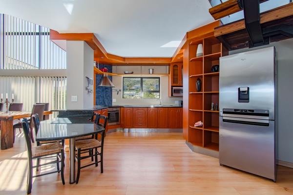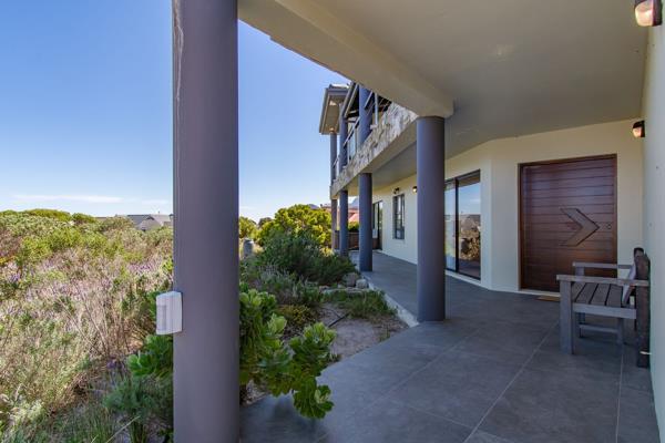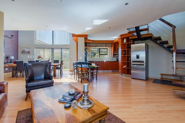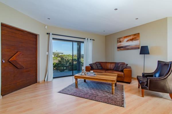 Upstairs, a floating staircase leads to a sea and mountain-facing entertainers paradise. Expansive sliding doors on both ends of the living area allow seamless flow between the indoor and outdoor spaces. The partially covered wraparound veranda, complete with a built-in braai, provides the perfect setting for relaxed gatherings with friends and family.