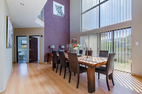 The impressive double-volume dining area, with floor-to-ceiling windows, forms the heart of the home and floods the space with natural light. A sliding door opens to the enclosed back garden the perfect setting for alfresco dining against the dramatic mountain backdrop.