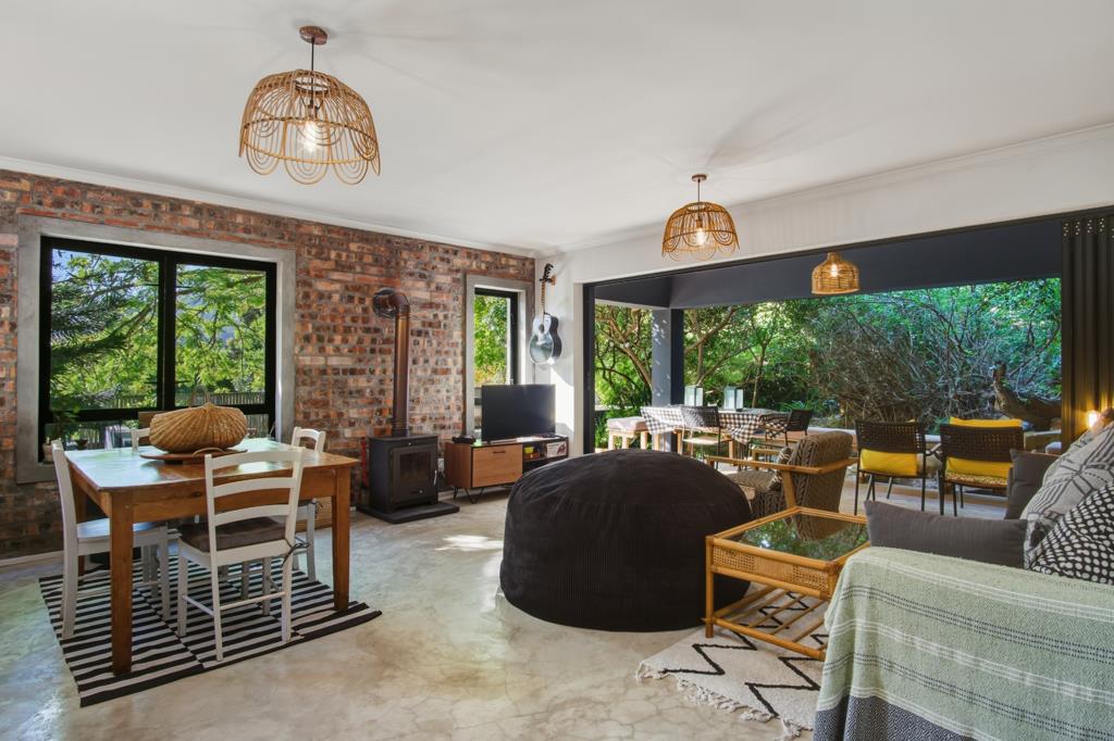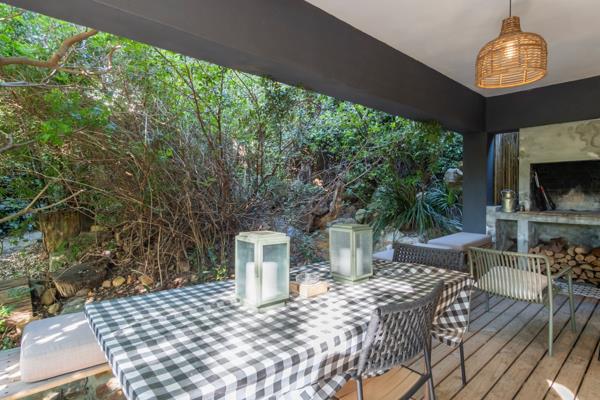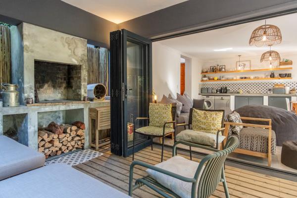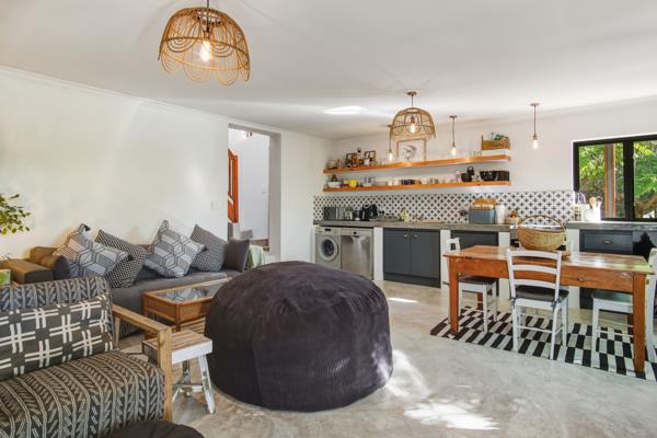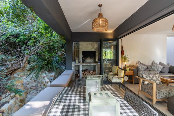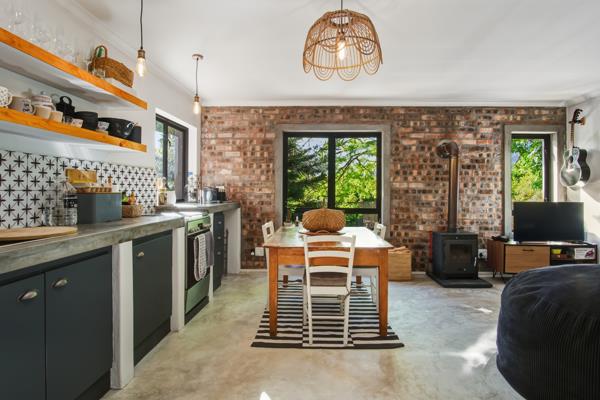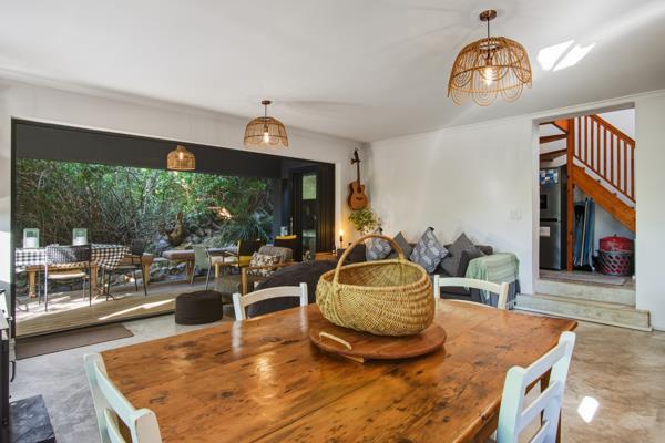 This contemporary residence features striking raw aesthetics with exposed elements and clean architectural lines. This home offers an open plan kitchen, dining/living room that has ample space with stacking doors that lead out to an undercover balcony that has a built in braai. In the kitchen there is a gas hob with electric oven and has enough space for two plumbed appliances. The living room comes fitted with a wood burner to warm the winter chills. Upstairs there are two bedrooms and two bathrooms. The main bedroom is en-suite with built in cupboards and a spacious balcony to take in the views. Outside you are engulfed with the privacy of nature with a lovely area for entertaining. The unit comes with one dedicated off street parking bay.