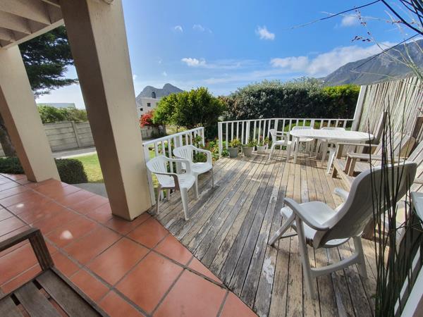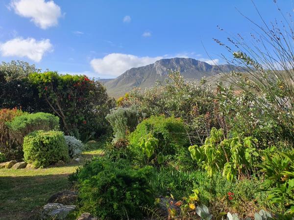 The established garden, complete with mature trees and a lawn, creates a peaceful setting with views of the Kogelberg mountains. The wooden deck area invites for outdoor entertaining.