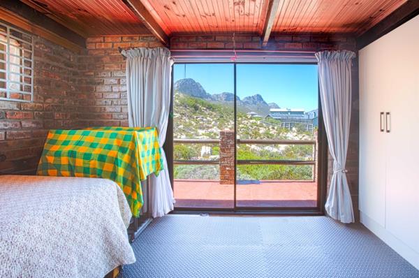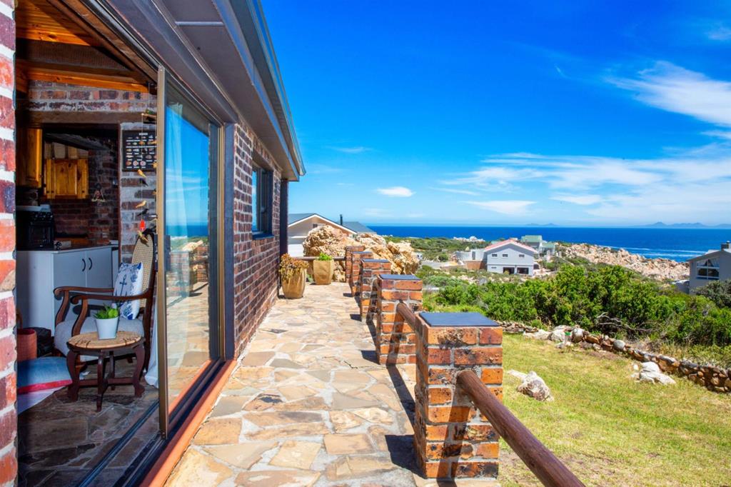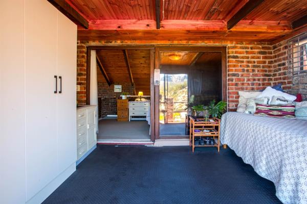 Inside, the home offers three bedrooms and two bathrooms. The main bedroom (with en-suite bathroom), is located upstairs and opens onto a balcony with beautiful sea views towards Pringle Bay. A second bedroom also enjoys its own balcony, this one west-facing with lovely sea views. The kitchen, scullery, and lounge flow together in an open-plan layout, anchored by a cosy fireplace. A second lounge, next to the office, leads out onto a peaceful stoepideal for morning coffee.