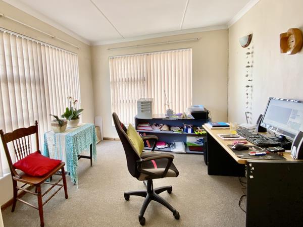 Ideal family home offers 3 bedrooms (main en suite and walk-in) all built-in cupboards plus bathroom (bath, shower, loo, basin) Open plan lounge - dining area double doors leading onto a large undercover stoep. Farm style kitchen, scullery. Entrance hall doubles up to a study. Double garage with direct access into kitchen.
