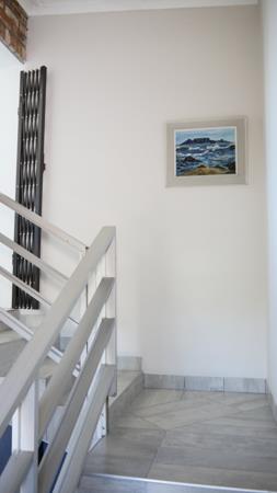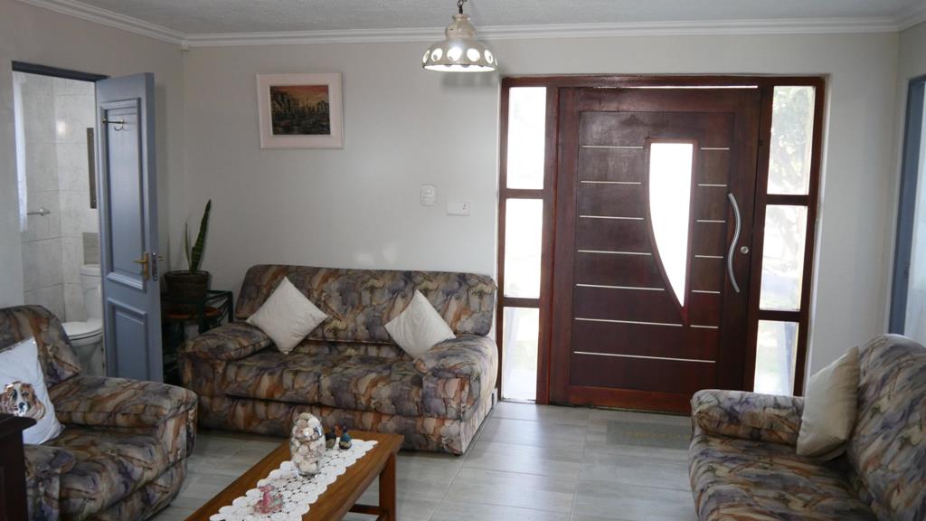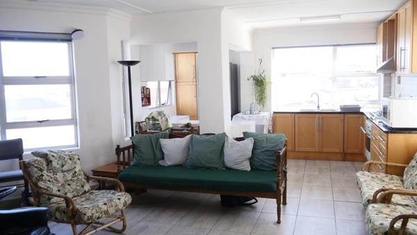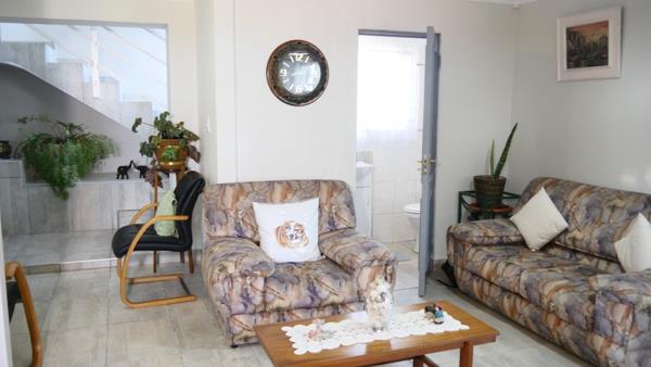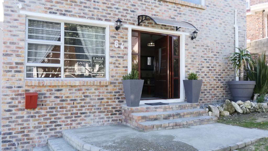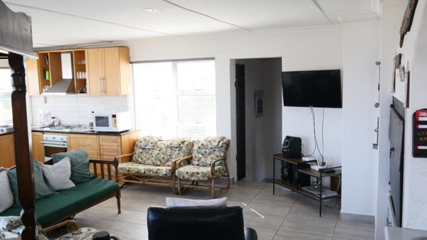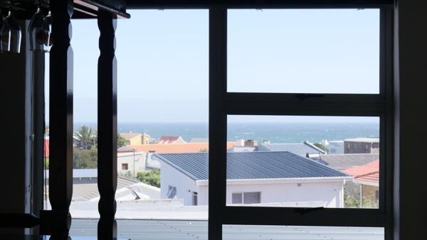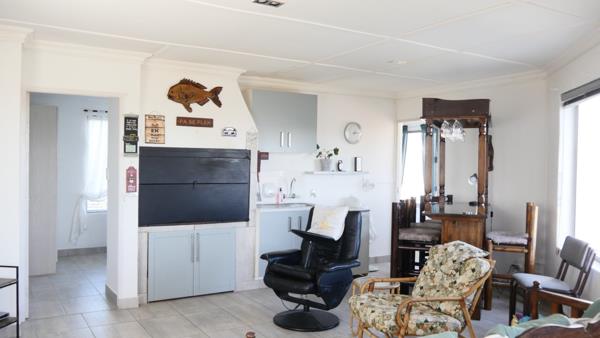This four-bedroom house offers scenic views from the first level. The open-plan living area features a spacious lounge, a built-in braai, and a modern kitchen. On this level, the master bedroom includes an en-suite bathroom with a bath and overlooks the view. The second bedroom also has an en-suite shower.