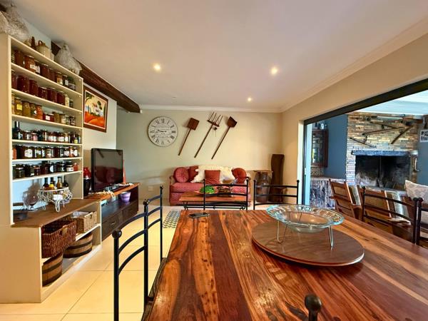 At the heart of the home lies a modern kitchen that is as functional as it is stylish, with stunning granite countertops, ample cabinetry, and a dedicated pantry for additional storage. Just off the dining area, youll discover a spectacular enclosed entertainment space, perfect for relaxed socializing. With folding stacker doors that seamlessly open to a beautiful garden complete with fruit-bearing grapevines, this space is designed for effortless indoor-outdoor living. Its complemented by a built-in braai, prep bowl, and basin, making it an entertainers dream.