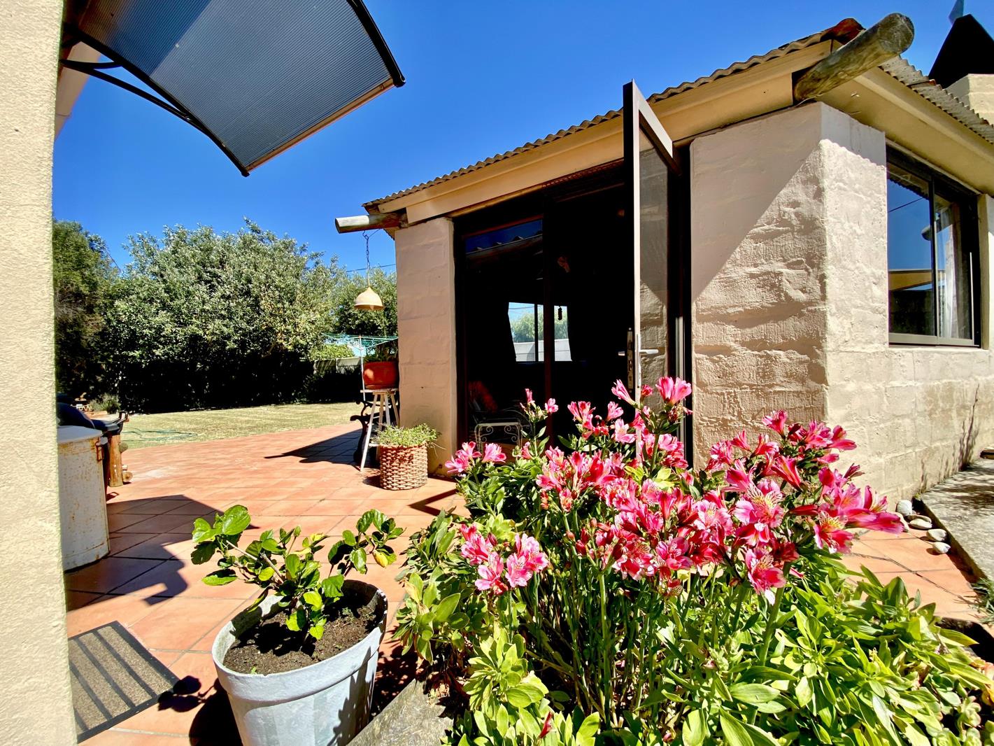 Outside, a separate entertainment area or man cave awaits complete with built-in braai, tiled floors, and a washing machine connection. Perfect for casual gatherings or as a versatile hobby space.