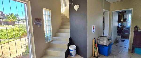 The open-plan kitchen is ideal for modern living, featuring an adjacent scullery for added convenience. The upstairs living and braai room offer distant sea views, perfect for entertaining all year round thanks to the built-in indoor braai. The home also features low-maintenance cement screed flooring throughout.