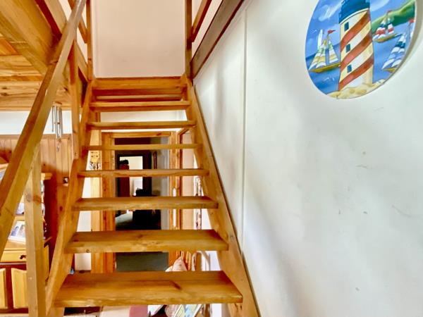 A set of solid wooden stairs leads to a spacious upper floor, matching the size of the entire open-plan living area belowa bright, airy space offering endless possibilities for expansion, entertainment, or additional accommodation.