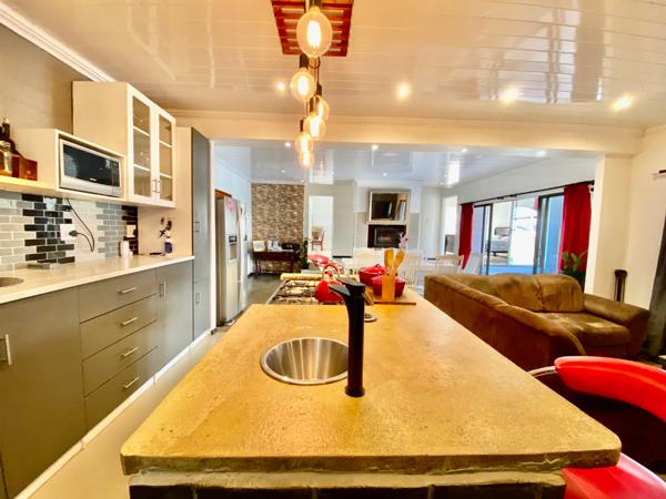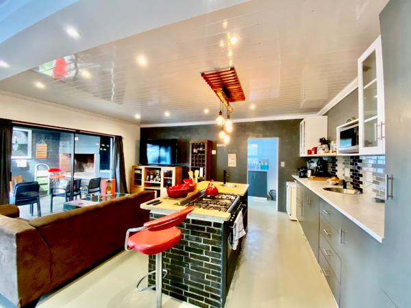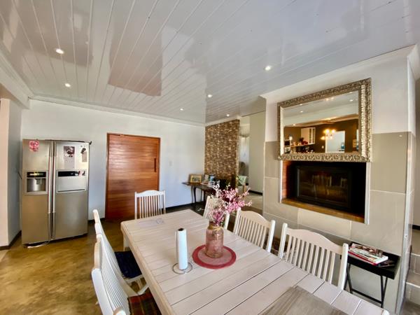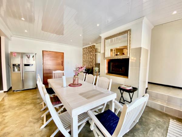 Inside, discover an open-plan living space with a modern kitchen featuring a gas stove in the centre island and separate laundry and scullery with direct access to the garage. Cosy winter evenings await by the slow combustion fireplace. The enclosed braai room with an extra large braai is perfect for entertaining right next to the pool.