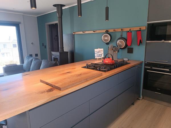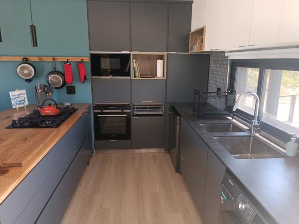 Luxurious three bedroom three bathroom double sized American imported container home with all the features you expect in a ultra modern home. Two rooms on the left is identical with pendant lights ceiling fans plenty of storage with the modern build in cupboards. Both rooms have walk-in showers with top of the range fittings, your chose to use gas or electricity a built in heater and extraction fans. The owners took time to think about all the luxuries on scale with LED light for the mirrors and bathroom vanities. All the surfaces is made with indestructible neolith, both beautiful and stylish. The kitchen is also extremely comfortable with plenty of storage space and a wooden counter highlighting the ultra-modern gas stovetop with reverse suction extractor fan and kitted with a oven, large modern microwave and two hidden stations for extra appliances. The extra strength beautiful drawers is ideal for plates, pots and pans ect. The counter also doubles as a dining area and blend in seamlessly with the living area with a built in braai and a state of art fireplace. The living room walks out to an ideal sized deck with partial sea view. The whole space of the main bedroom is the same as the two rooms with a separate toilet and shower and a modern bath. All furniture is also included in the priced to go asking price. Just a street away from the sea this large plot is your playground to develop
