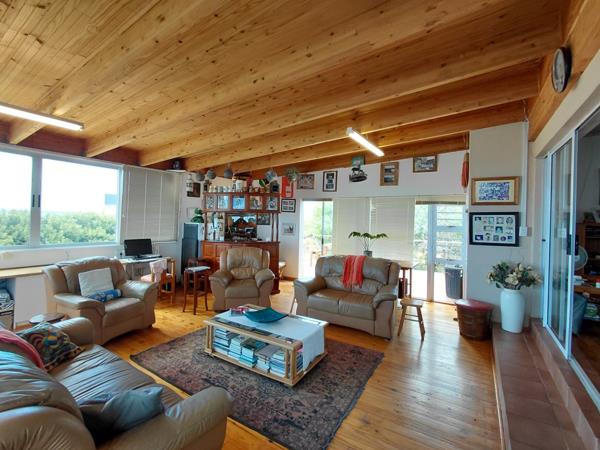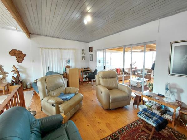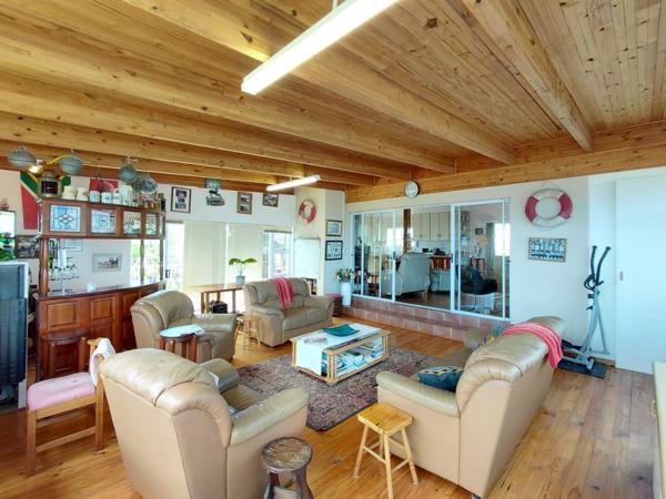 A stunning wooden staircase leads to the first floor, which boasts a large, open-plan, and well-appointed fully fitted kitchen complete with a built-in stove and abundant cupboard space. The lounge and dining area offer breath taking sea views and include a guest toilet, a built-in bar, and an indoor braai that opens onto a patio with stunning sea vistas.