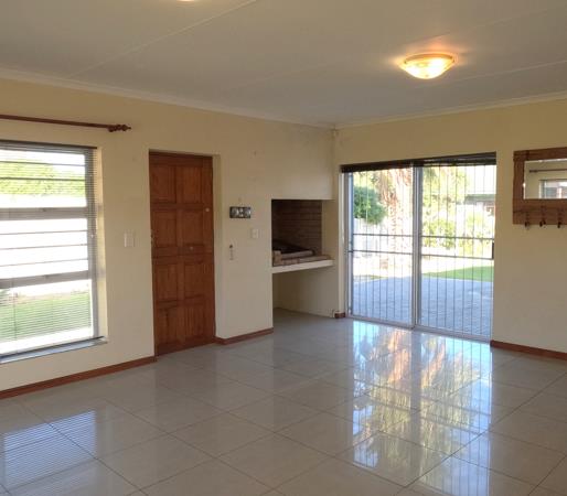 Entering the house from the front stoep into an open plan Livingroom / kitchen with an inside braai an exit through a sliding door to the back garden with paving and grass or step into the well-equipped planned kitchen with neat built-in cupboards, gas stove, granite stone top island and a lot of space for white furniture. The passage led to the three well-sized bedrooms with wool carpets, built-in cupboards and venation blinds. The full main bathroom is tiled to the ceiling and inviting due to sunny window. The master bedroom is well-sized, with lots of built-in cupboards and a dressing table with on-suite bathroom walls tiled to the ceiling.