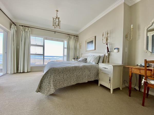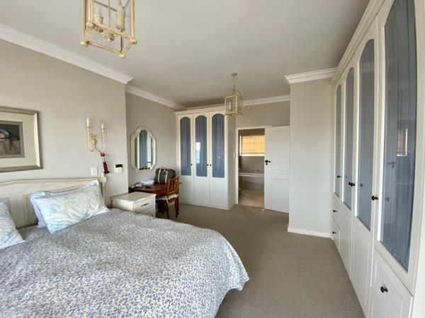 A luxurious upstairs main bedroom with an en-suite bathroom, ample closet space, and sliding doors that open onto the balcony, offering uninterrupted panoramic sea views.