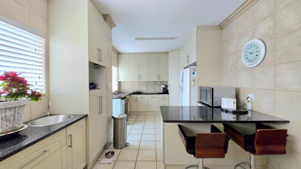 The home is designed for comfort and style, with a spectacular main kitchen that includes ample cupboard space, a scullery, and a pantry. The large open-plan living and dining room opens onto an enclosed balcony with a built-in braai, providing a perfect space to enjoy the amazing views.