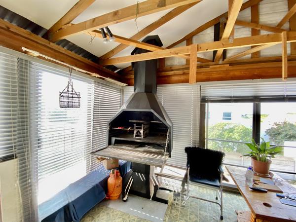 A cozy sunny braai / sunroom with a fireplace /braai installed.