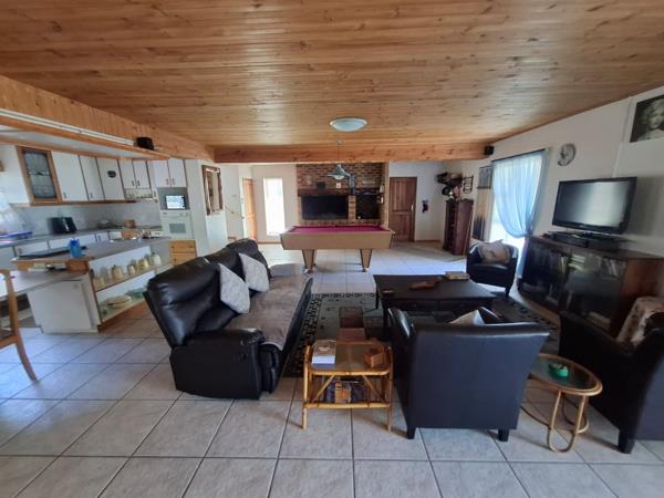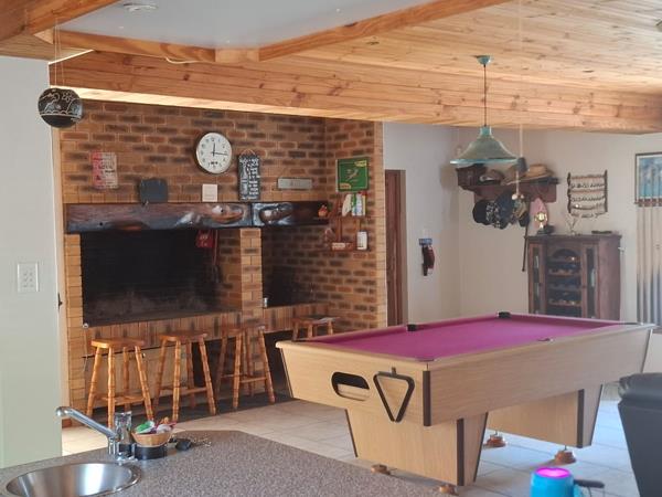 The open-plan kitchen, with its big centre island and workspace area, flows into a huge living area where the double indoor braai takes centre stage perfect for lazy weekends and big family gatherings, no matter the weather. Large enough for a pool table.