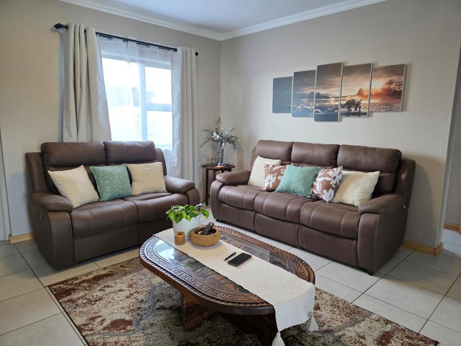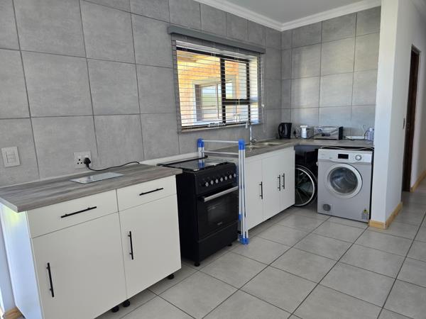 It features tiled flooring throughout, built-in cupboards, modern light fixtures, and stable doors, which contribute to both space and charm. The attention to detail and commitment to sustainability are reflected in the fitted blinds, two solar geysers, energy-efficient light bulbs, and gas hob and oven.
