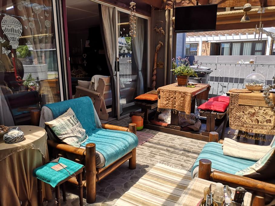This two bedrooms with two bathrooms offers lots more. Fair size kitchen with an open plan lounge/TV room and a built in braai/fireplace that lead to an outside under roof entertainment area with roll down canvas windows for the rainy days. A guest bathroom and laundry with lots of storage space. Your car can be parked under roof on the side of the entertainment area. Sitting outside by the boma fire pit enjoying some wine with friends and family while the kids can roam the resort or walk to the private entry to the beach. What more do you need but, peace and fresh air from the ocean.