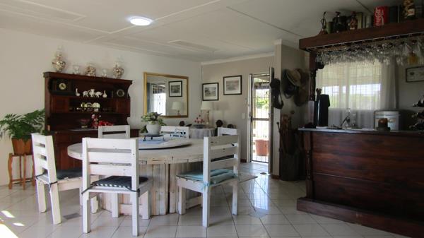 The separate lounge features a built-in braai, ideal for cozy evenings or entertaining on windy days. The open-plan kitchen, dining and bar area creates a warm and welcoming space perfect for family gatherings or relaxed entertaining. A breakfast nook, gas hob, and electric oven complete the kitchen, designed for both functionality and style.