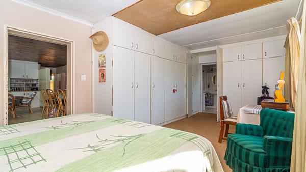 A few steps lead up to a raised kitchen and dining area, filled with natural light and well-suited to both quiet meals and lively gatherings. To the right of the kitchen, the main bedroom provides a private retreat with ample built-in cupboards and a full en-suite bathroom featuring a bath, shower, basin and toilet.