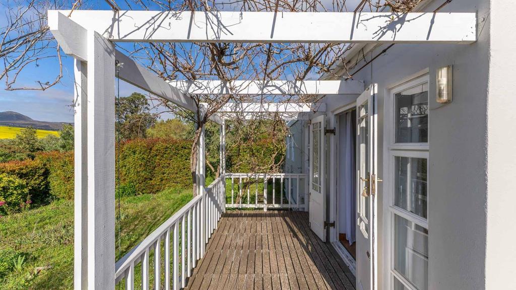 Recently renovated, the home offers two generous en-suite bedrooms, with French doors that open to private patios, inviting the landscaped gardens in. From every window and doorway, you are met with the poetry of the outdoors -- roses in bloom, fruit and nut trees heavy with promise, and the whisper of leaves stirred by the Overberg winds.