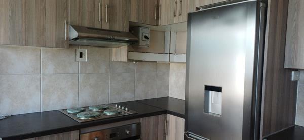 This home offers 2-bedrooms, 2-bathrooms, living room, kitchen with built-in cupboards, electric hob and oven.