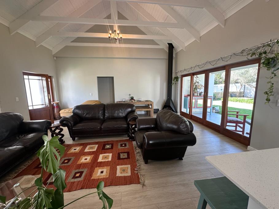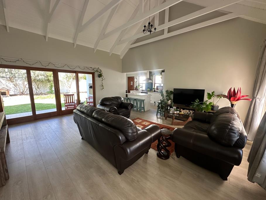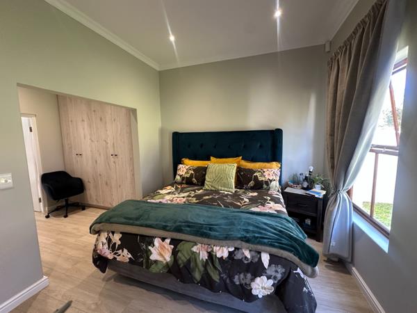 Entering the front door, you step into the spacious double volume lounge with a fireplace. The living areas are completely open plan with a dining area and a kitchen. From the living areas are stack doors leading to a very private entertainment patio with a built-in braai. The open plan kitchen with its walk around island has ample cupboard space with a gas hob and an electric oven. The garage is accessible from the kitchen.