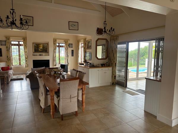 The spacious design includes a double volume open-plan living area featuring a modern kitchen with a separate scullery, dining, and TV room that seamlessly flow onto a private entertainment patio with a pool and an undercover braai areaa cosy spot to enjoy the serene sounds of birdlife and take in the spectacular farm surroundings.
