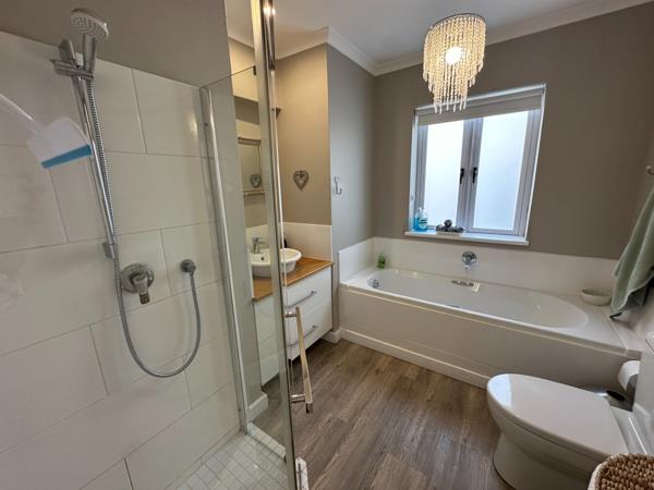 The Vinal flooring provides a warm and comfortable feel throughout the whole house. Down the passage you will find the 2 bedrooms and 2 bathrooms. The spacious main bedroom is light and airy due to its north facing windows. The main bathroom has an extra big shower. The 2nd bedroom has a separate bathroom with a shower and a bath. The study is accessed from the dining area with a door leading to the back garden.