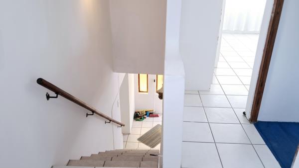 The main bedroom, located upstairs, has a balcony and an en-suite bathroom with both a bath and a shower. The backyard offers an entertainment area with a braai area.
