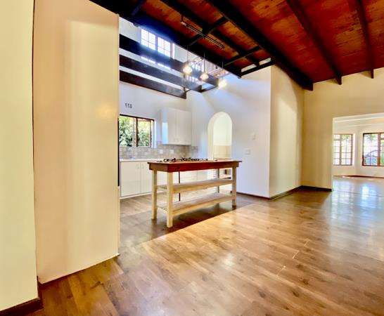 Three bedrooms plus 2 bathrooms downstairs, lounge, dining room, open plan kitchen with a separate scullery area plus a large family room with a built in braai, leading out into the back garden. The potential studio is a double garage with a single garage attached. A wonderful additional space which could also be turned into a granny flat or a large playroom.