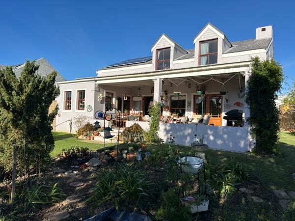 The property is also incredibly energy-efficient, featuring 14 solar panels, a 4.6kW inverter with a battery, and a separate solar geyser, which contributes to a sustainable lifestyle. Upon entering through the wooden front doors, you are greeted by an entrance hall that leads to the inviting living areas and a spacious patio with amazing views. Downstairs, you''ll find an open-plan lounge with a cozy fireplace, a dining area complete with cupboards and an island hosting a gas hob, and a well-appointed kitchen with direct access to the double garage.