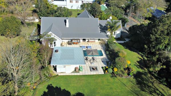 The interior features a formal lounge, complete with a fitted fireplace, built-in units and a study office that links easily to the open-plan family room and dining area. This inviting space also boasts a fireplace and double doors that open onto the patio, providing picturesque views of the manicured garden and mountains. The open-plan kitchen is designed for easy entertaining, showcasing a centre island and modern units, and includes an inter-leading pantry with fitted units and a separate laundry room.
