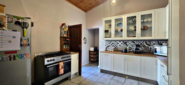 The main house offers four bedrooms one currently used as a dining room, with the main bedroom featuring an en-suite bathroom and a separate guest bathroom. It has an open-plan living area with a fireplace and a modern kitchen with a separate scullery and laundry room.