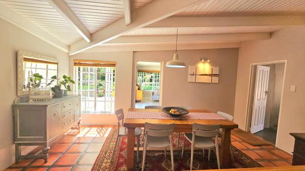 The main house boasts three spacious bedrooms and a study. The heart of the home features a stunning open-plan design that seamlessly integrates a stylish TV room, dining, and kitchen area for effortless entertaining with stacking doors opening up onto a braai and pool area. A charming separate living room invites you to unwind, showcasing high ceilings and beautiful wooden features that enhance the homes character.