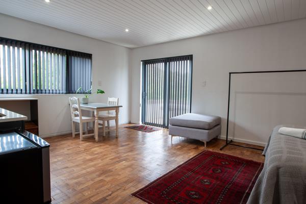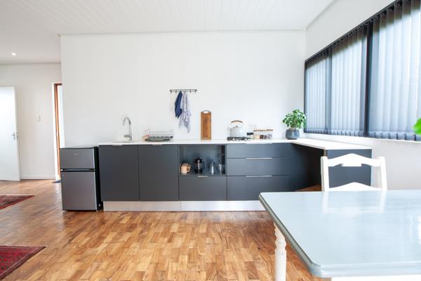 The ground level offers bright, open-plan living and dining areas, perfect for entertaining or simply enjoying quiet moments. Large stackable doors open onto a patio, extending the living space outdoors. Also on this level is a spacious bedroom with Kiaat Parque Flooring and a stylishly designed bathroom. The contemporary kitchen is well-equipped with a prep bowl, gas hob, and a separate scullery, laundry area, and walk-in pantryensuring both practicality and plenty of storage.