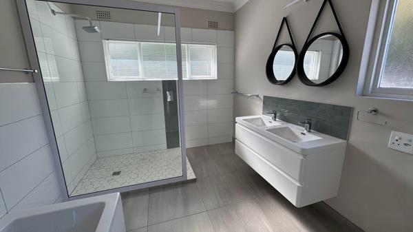 A wide staircase leads to the elevated main living area, all on one convenient level. Inside, the double-volume ceilings and large windows create a bright, airy atmosphere, enhancing the open-plan lounge, dining area, and designer kitchen.