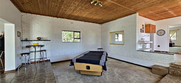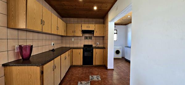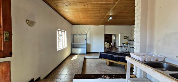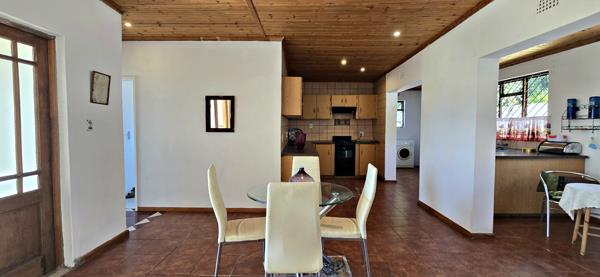 The open-plan kitchen offers ample cupboard space and includes a separate scullery and laundry area. Flowing seamlessly from the kitchen is a welcoming dining area with a cosy fireplace, as well as an open-plan lounge ideal for relaxation.