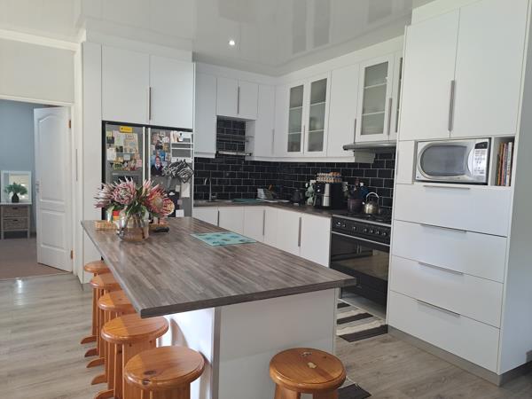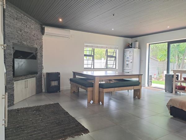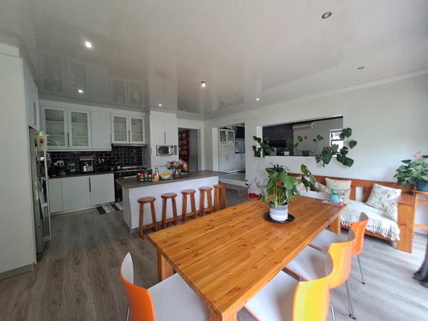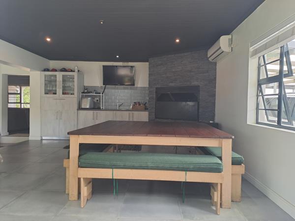Open-plan kitchen and dining area with aluminium doors that open up to the rear garden creating a perfect blend of indoor and outdoor living. The braai room offers year-round enjoyment and transforming your space into a cozy haven for gatherings and relaxation.