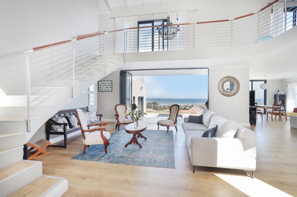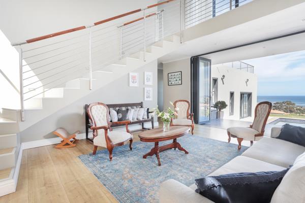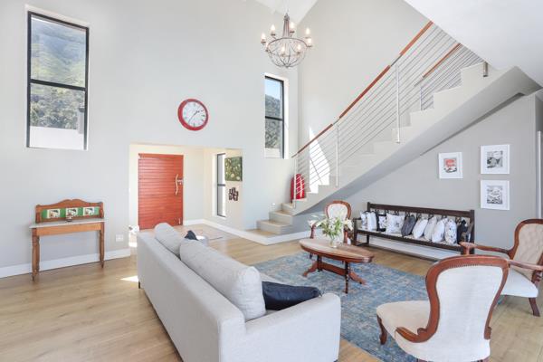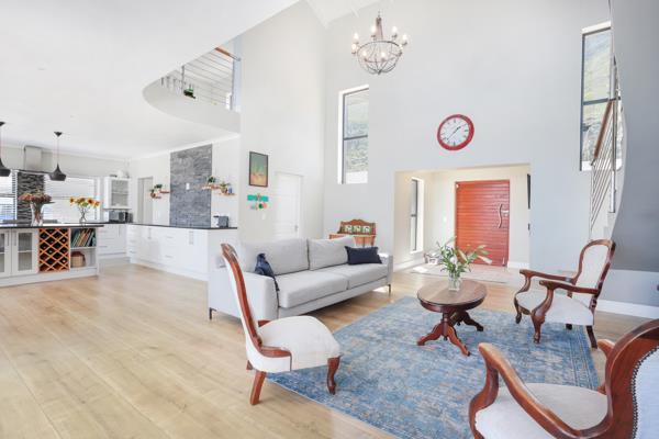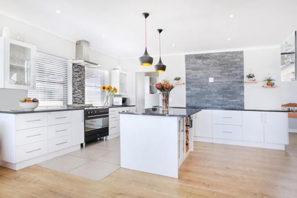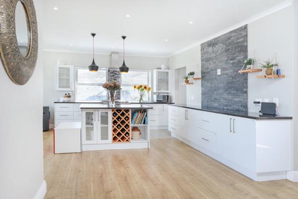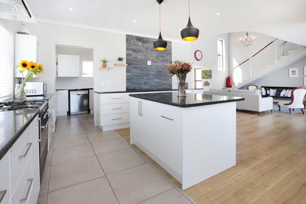 The ground floor features a generously sized open-plan kitchen, complete with a separate scullery, and a dining room that has sliding doors opening to the garden. The spacious lounge opens up to the pool and an undercover patio, which includes a built-in braai and a guest powder room.