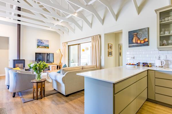 Complemented by a beautifully modern kitchen, complete with Caesarstone countertops, ample cupboards, and a separate scullery. Its open-plan flow to the double-volume living areas creates both ease and atmosphere. Exposed trusses add a sense of space, while a wood-burning fireplace invites cozy evenings. For year-round enjoyment, the enclosed patio with sliding doors has been transformed into a delightful indoor braai areaperfect for gathering with friends or enjoying quiet nights in.