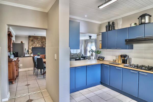 The property features an open-plan lounge and dining area with a built-in braai, seamlessly flowing into a bright sunroom that overlooks the garden. This inviting space is perfect for hosting family gatherings or enjoying peaceful relaxation. The kitchen, a culinary enthusiast''s dream, is fully equipped with a double oven and gas stove, complemented by a separate laundry and scullery area to ensure a tidy, organized environment.