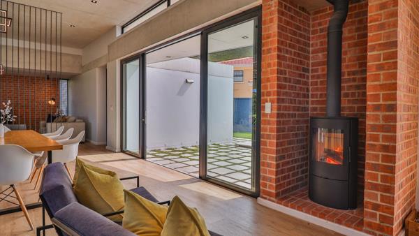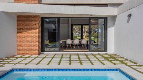 The dining room boasts a cozy wood-burning fireplace, creating a warm ambiance as you enter the home. On the northern side, it seamlessly extends to a sun-kissed pool area, perfect for relaxation and enjoying the Hermanus sunshine. To the south, a large covered patio with a built-in braai invites alfresco dining and overlooks the expansive manicured lawn and the verdant golf course beyond.