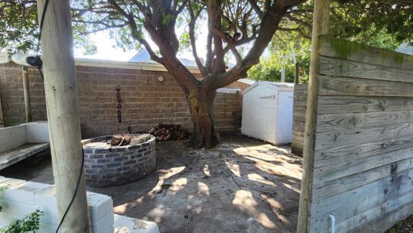 The separate lounge features a large fireplace, perfect for cooler evenings. The sunny enclosed patio at the back has large sliding doors that open into the garden, which includes a spacious entertainment area under a large tree with a boma, perfect for family gatherings. Additionally, there is a Wendy house and a shower for rinsing off after returning from the sea.