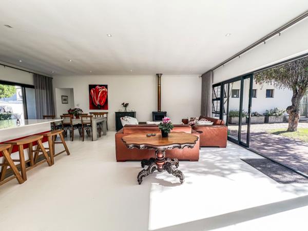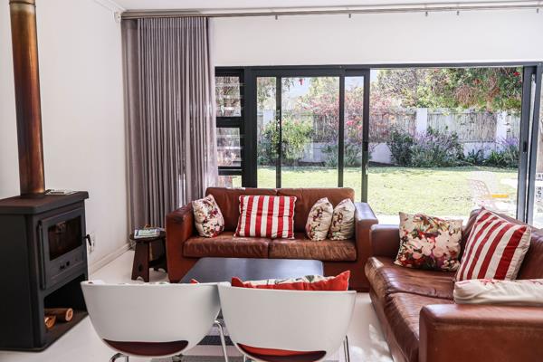 Modern North-facing Haven with Separate Flatlet in Tranquil Onrus. Joint Mandate Situated on a double plot in a prime location in Onrus, the modern residence offers the perfect blend of space, light and comfort. Designed for effortless family living, the home boasts open plan living areas that flow seamlessly to a modern kitchen, dining and lounge spaces, complete with a wood burning fireplace for cosy evenings.