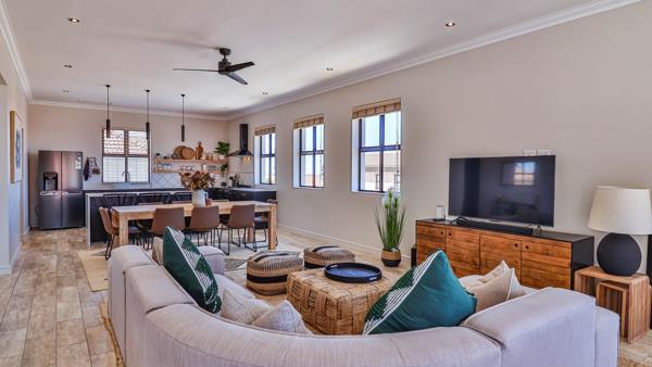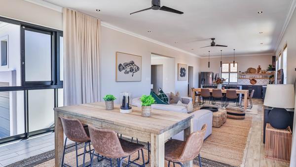 Designed for luxurious, comfortable living, the residence features three spacious en-suite bedrooms with king-sized beds. The heart of the home is an expansive open-plan area encompassing the kitchen, dining room, living room, and braai area, facilitating seamless entertaining and featuring ocean views throughout.