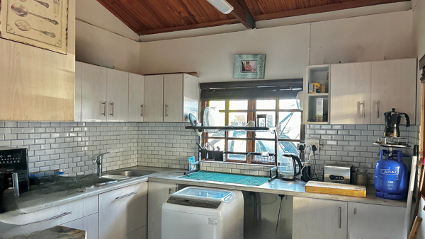The cabin features a functional kitchen with all the necessary fittings and ample cupboard space, flowing into a well-sized open-plan lounge and dining area with an indoor braai, perfect for relaxed, all-season entertaining. The main bedroom is generously sized, filled with natural light, and fitted with built-in cupboards.